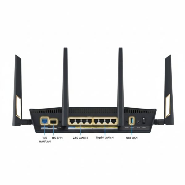 Beyond its wireless capabilities, the RT-BE88U boasts exceptional wired connectivity. It features a 10 Gigabit WAN port and a 2.5 Gigabit WAN/LAN port, providing ultra-fast internet access for fibre optic connections and the ability to connect high-bandwidth devices such as NAS systems, gaming PCs, or workstations. With multiple Ethernet ports, you can easily create a high-speed wired network for critical devices, ensuring maximum data transfer speeds and minimal latency. This makes it an ideal choice for small offices, studios, or homes where wired performance is paramount, complementing its high-speed router capabilities.